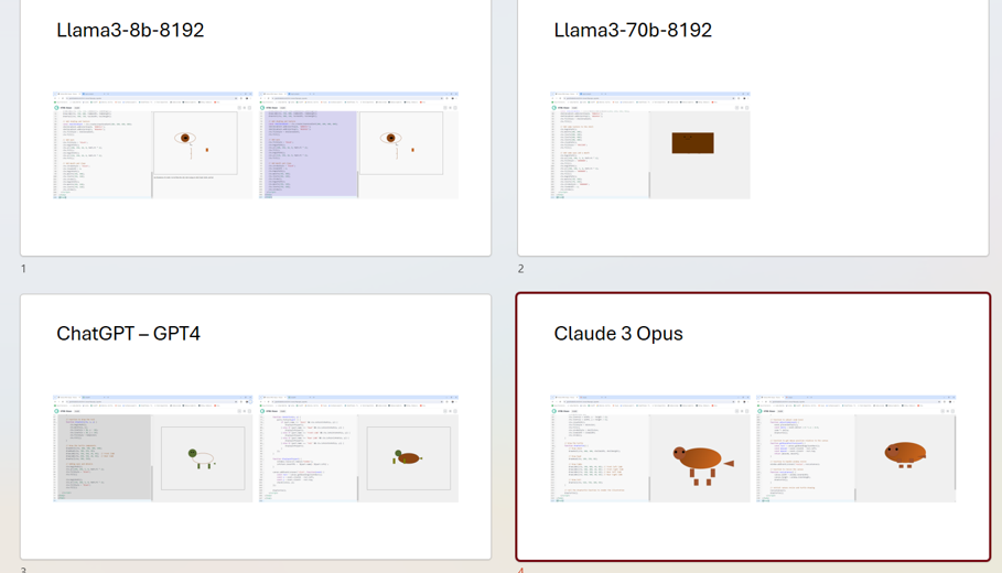 Also for the description I forgot to mention, that’s Claude 3 opus with 6 step workflow to generate html code to use shapes to draw pictures of complex objects (no visualization analysis was used…model is blind for whole execution)