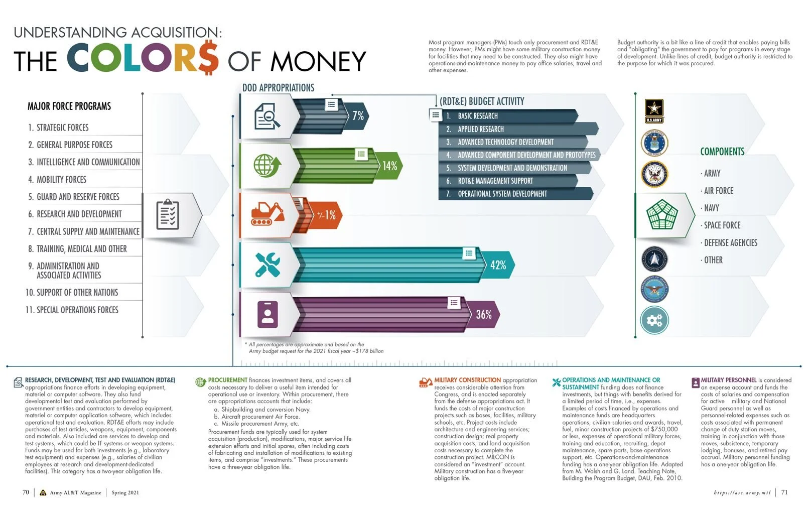 “Colors of money, like lots of concepts in defense-speak, is misleading but not inaccurate. There is, in fact, no actual money. Neither are there colors. Congress gives DOD budget authority, that is, but the authorization to obligate the government to pay bills with appropriated funds. There are five colors of money, but color is only one dimension. Another dimension is time. Each color has a use-by date. Another dimension is the different ways that Congress and DOD slice and dice the different categories of budget authority. Colors of money is a way of expressing and controlling what a budget authority may and may not be used for. It is accounting, but also a way to understand how Congress and DOD talk to one another.”