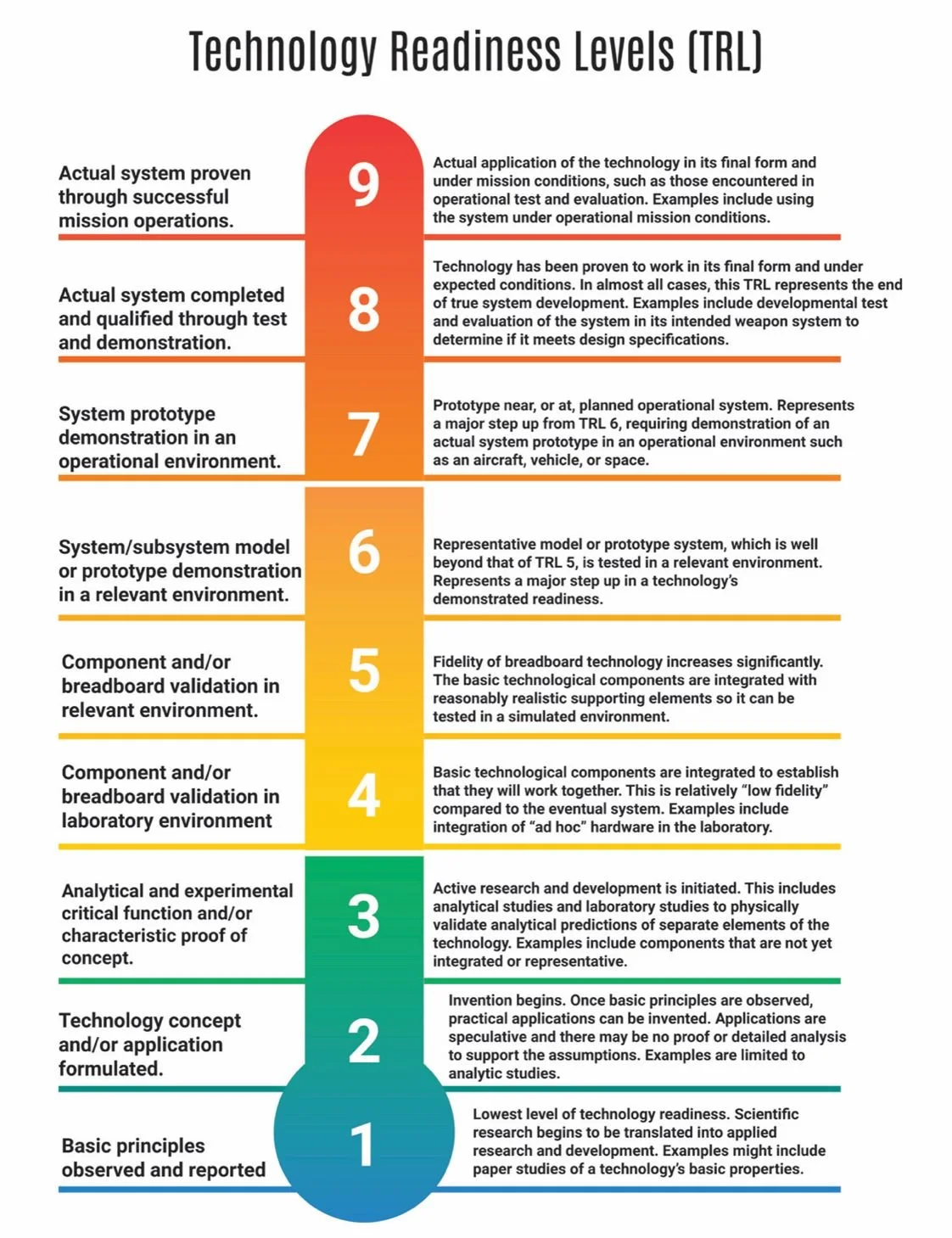 “Technology readiness levels (TRLs) are a method for estimating the maturity of technologies during the acquisition phase of a program. TRLs enable consistent and uniform discussions of technical maturity across different types of technology. TRL is determined during a technology readiness assessment (TRA) that examines program concepts, technology requirements, and demonstrated technology capabilities. TRLs are based on a scale from 1 to 9 with 9 being the most mature technology.”